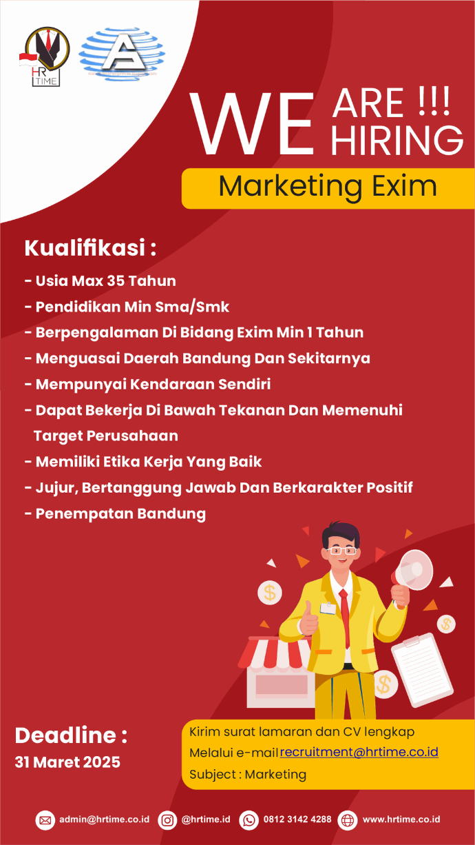 Apakah Anda memiliki semangat tinggi dalam dunia ekspor-impor dan ingin mengembangkan karier di perusahaan yang terus berkembang? Jika Anda seorang negosiator ulung, cerdas dalam membangun hubungan bisnis internasional, serta paham prosedur ekspor-impor, maka kami ingin Anda bergabung dengan tim kami!