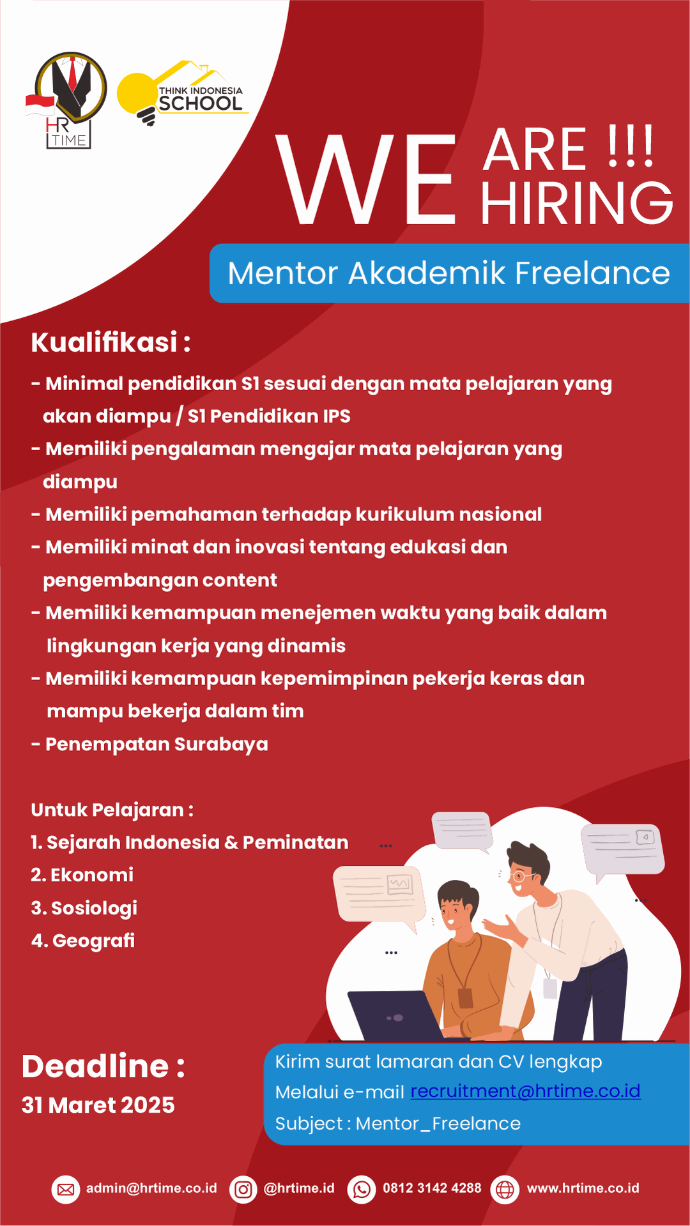 Jika Anda memiliki passion dalam dunia pendidikan dan ingin berkontribusi dalam pengembangan akademik peserta didik, segera kirimkan CV dan surat lamaran Anda ke recruitment@hrtime.co.id sebelum 31 Maret 2025.