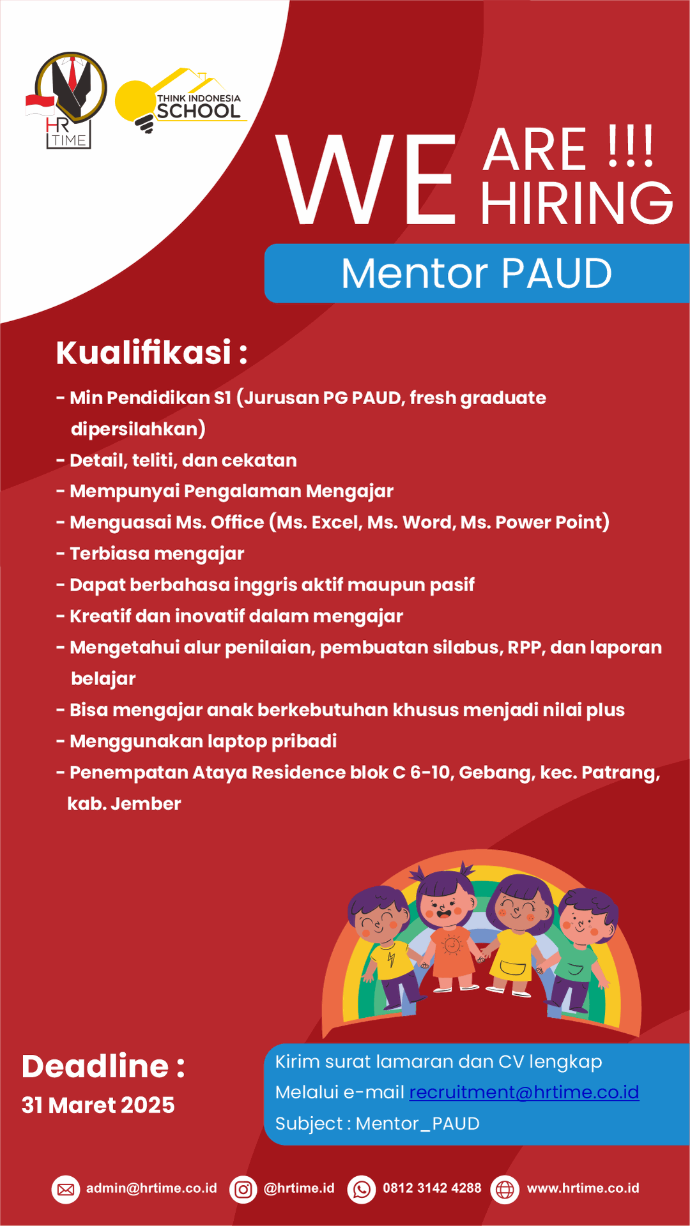 - Pendidikan minimal S1 PAUD/Psikologi/Pendidikan atau bidang terkait.