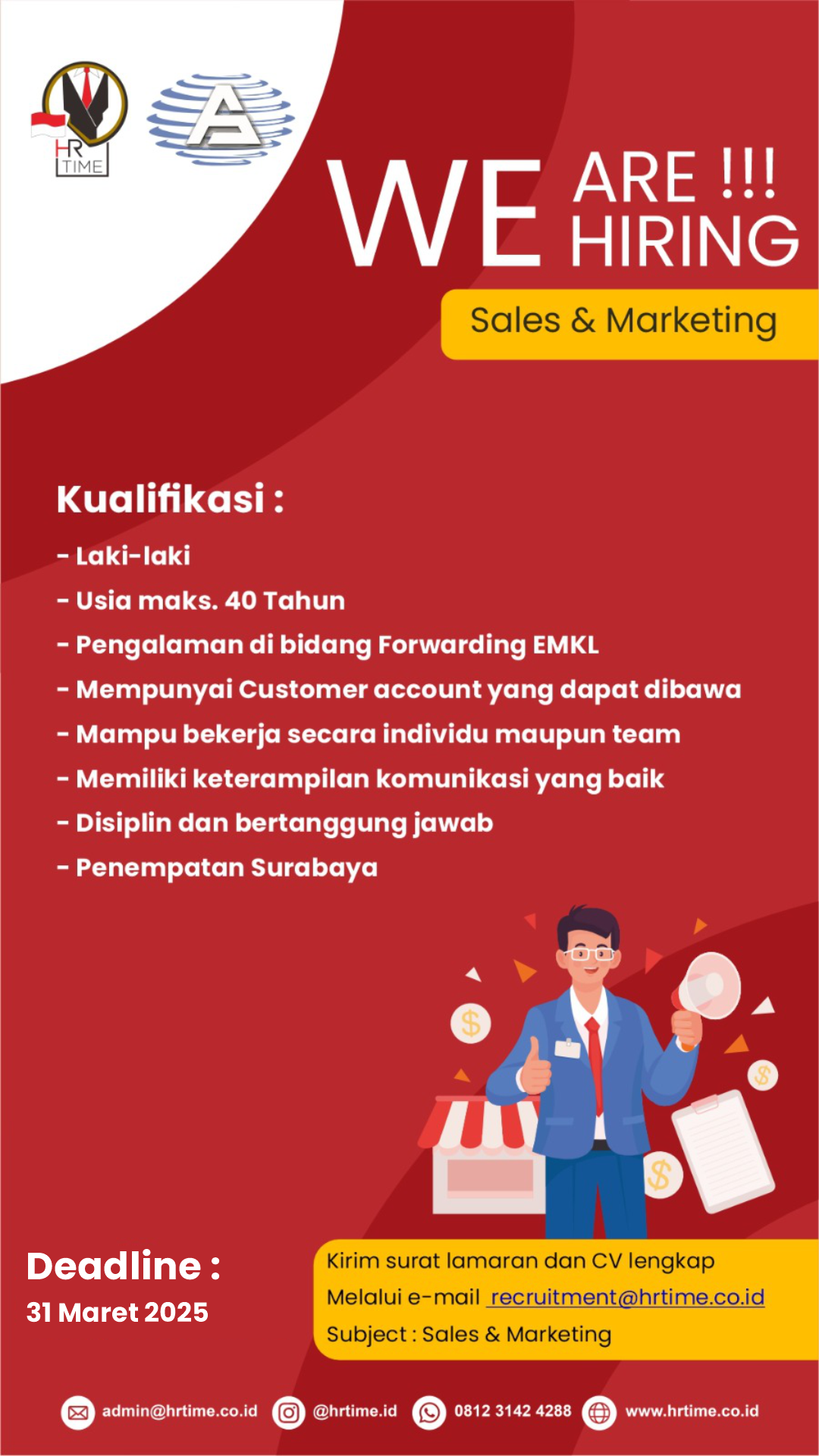 Jika Anda tertarik dan memenuhi kualifikasi, kirimkan CV dan surat lamaran ke recruitment@hrtime.co.id atau klik tobol melamar sekarang juga.