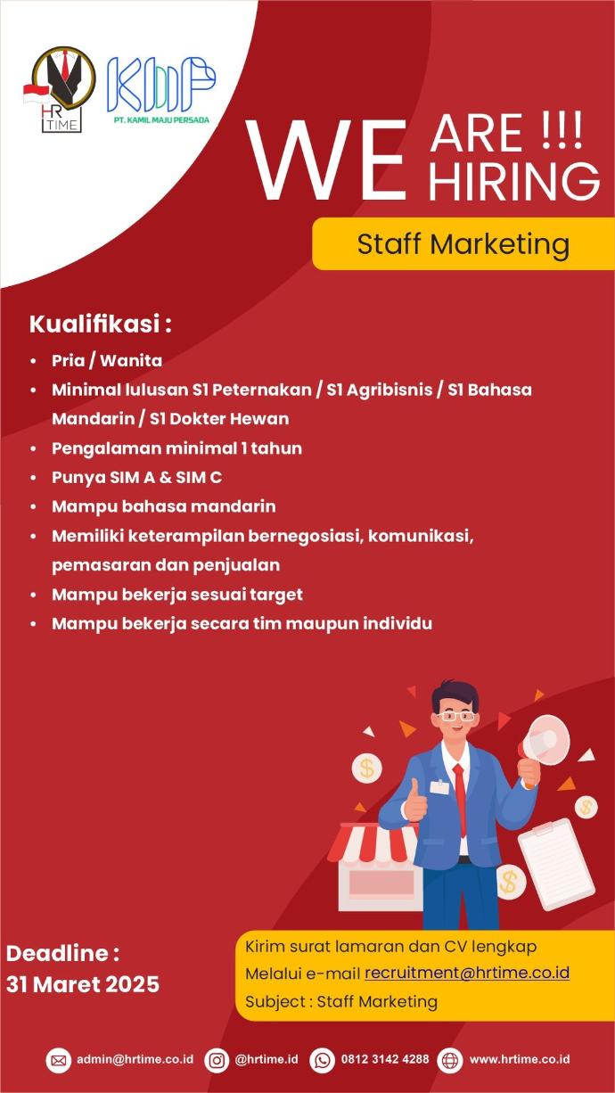 Kami mencari Staff Marketing yang kreatif, komunikatif, dan berorientasi pada target untuk bergabung dengan tim kami. Posisi ini bertanggung jawab atas strategi pemasaran, promosi produk, serta menjalin hubungan dengan pelanggan dan mitra bisnis guna meningkatkan penjualan dan brand awareness.